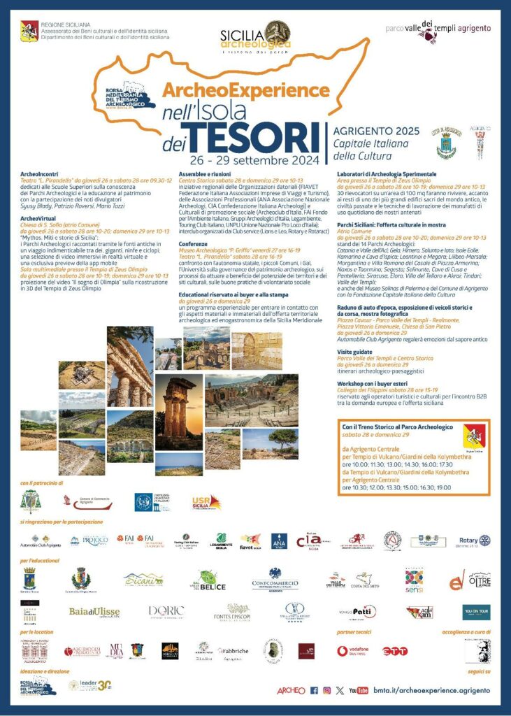 Si svolgerà al Agrigento da giovedì 26 a domenica 29 settembre l’evento Archeoexperience nell’Isola dei Tesori con l’obiettivo di valorizzare le 14 aree dei parchi archeologici del territorio siciliano, tra cui la VALLE DEI TEMPLI DI AGRIGENTO. ArcheoExperience nell’Isola dei Tesori è ideato e diretto dalla Leader srl, titolare del marchio della BMTA di Paestum, Borsa Mediterranea […]