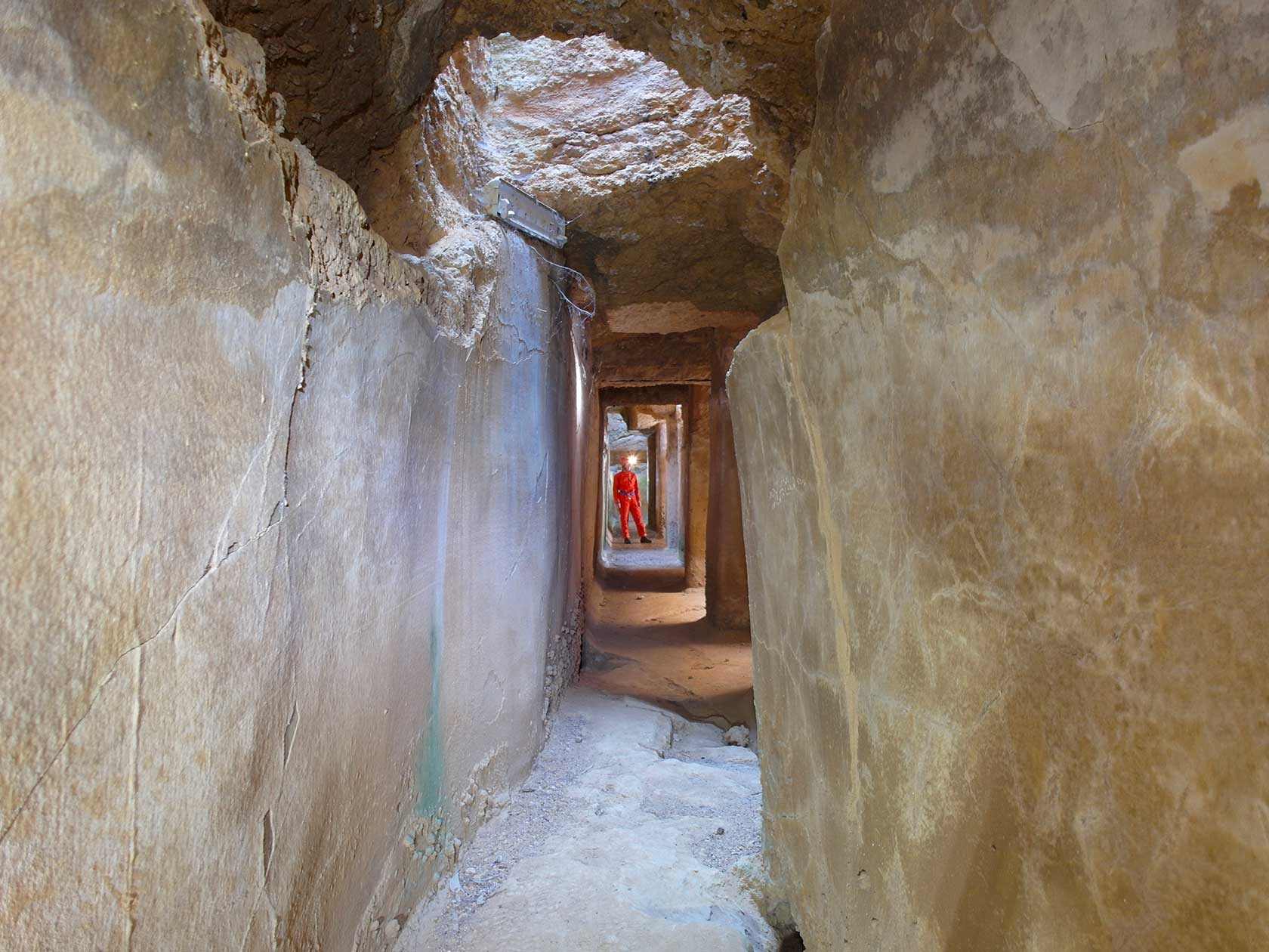 Due cunicoli, alti m1 e larghi m0,75, si aprono nella parete orientale di quest’ambiente di forma quadrata: essi hanno il letto più ribassato rispetto alla cavità-cisterna e sfociano all’aperto.